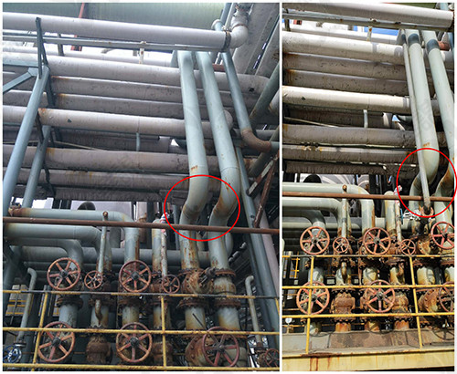 在污氮?dú)夥謿獍隹诠苌嫌脧U舊管道連接新老系統(tǒng)洗塔管,通過此管道其余10臺(tái)塔也能用污氮?dú)庀此?/p>
